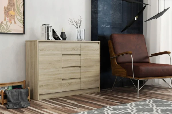 W środku znajdziesz cztery pojemne szuflady oraz dwie szafki z półkami, które zapewniają mnóstwo miejsca na przechowywanie – dokumentów, ubrań czy domowych drobiazgów. Dzięki temu z łatwością utrzymasz porządek w swoim wnętrzu.
