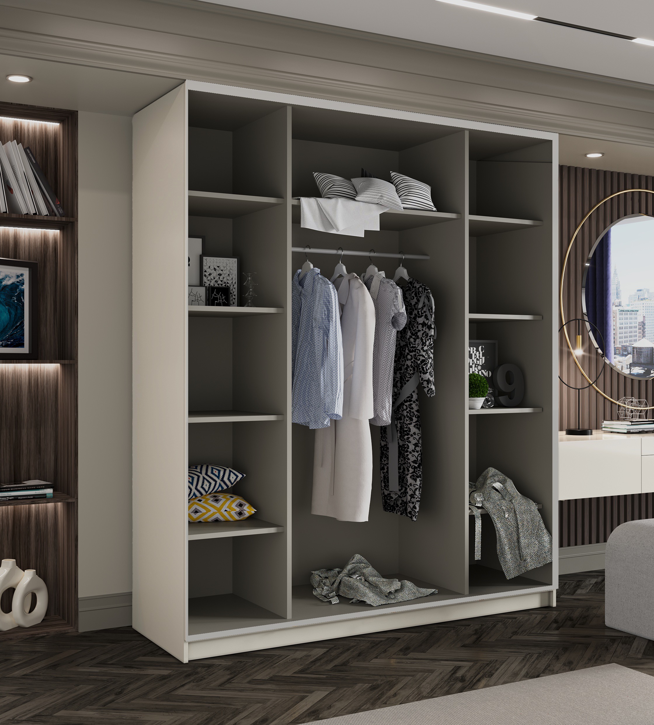 Praktyczne wnętrze podzielone jest na półki na przedmioty/ubrania oraz wieszaki. Drążki do wieszania zawarte są w cenie.