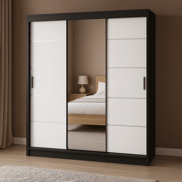 Pojemna szafa trzydrzwiowa RIO-3 180 z dużym lustrem oraz z systemem drzwi przesuwnych.