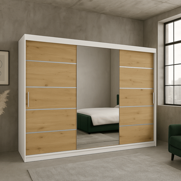 Pojemna szafa trzydrzwiowa RIO-3 180 z dużym lustrem oraz z systemem drzwi przesuwnych.